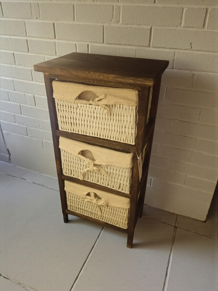 Este mueble es una cajonera o estante organizador de madera con tres canastos, ideal para el baño o cualquier otro espacio del hogar.