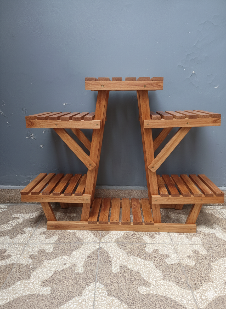 Este elegante y funcional porta macetero de madera natural es la solución perfecta para exhibir tu colección de plantas, flores y suculentas, optimizando el espacio en cualquier lugar de tu hogar, balcón o terraza.