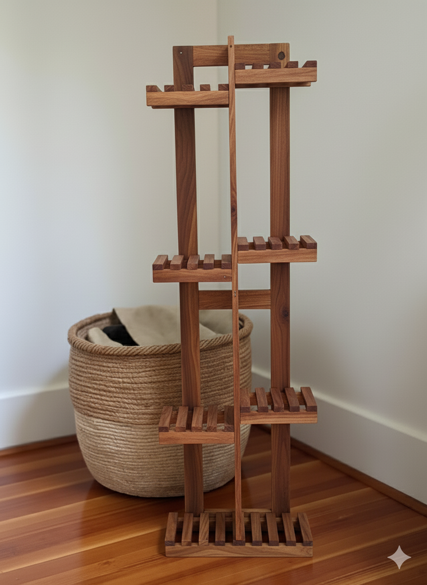 Este elegante y funcional porta macetero de madera natural es la solución perfecta para exhibir tu colección de plantas, flores y suculentas, optimizando el espacio en cualquier lugar de tu hogar, balcón o terraza.